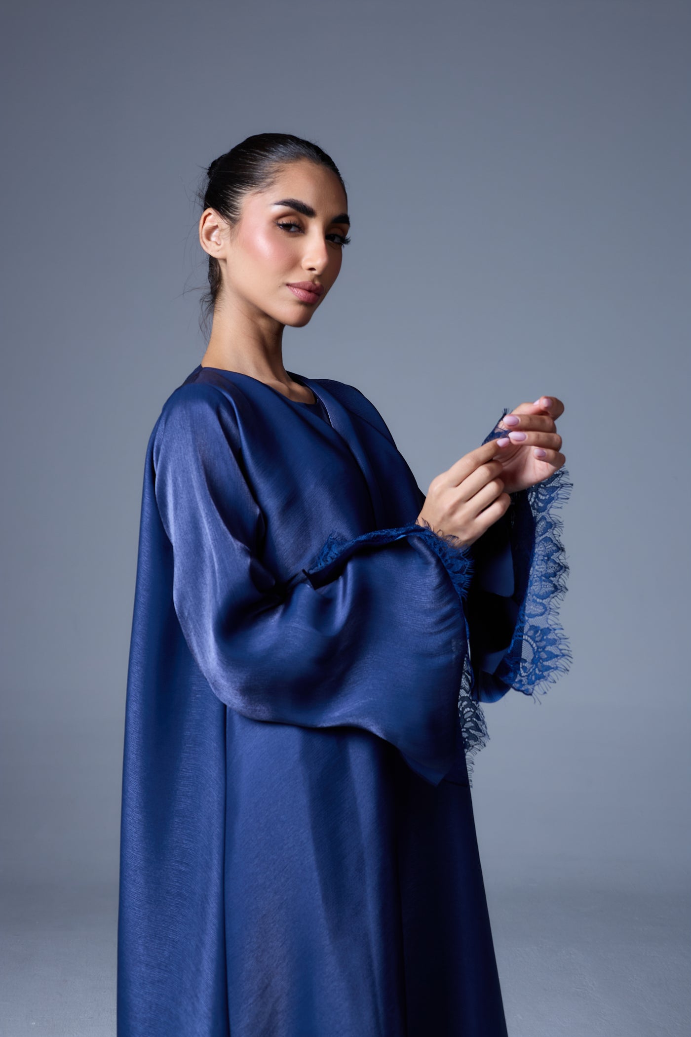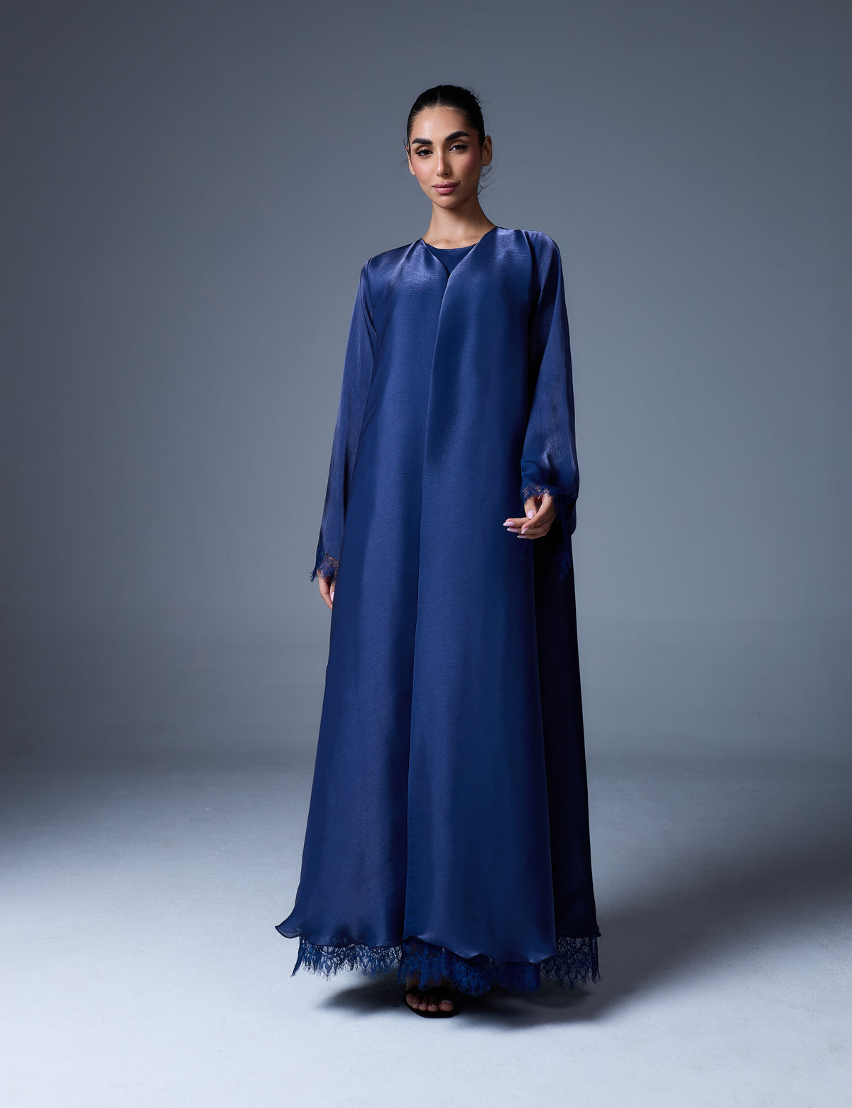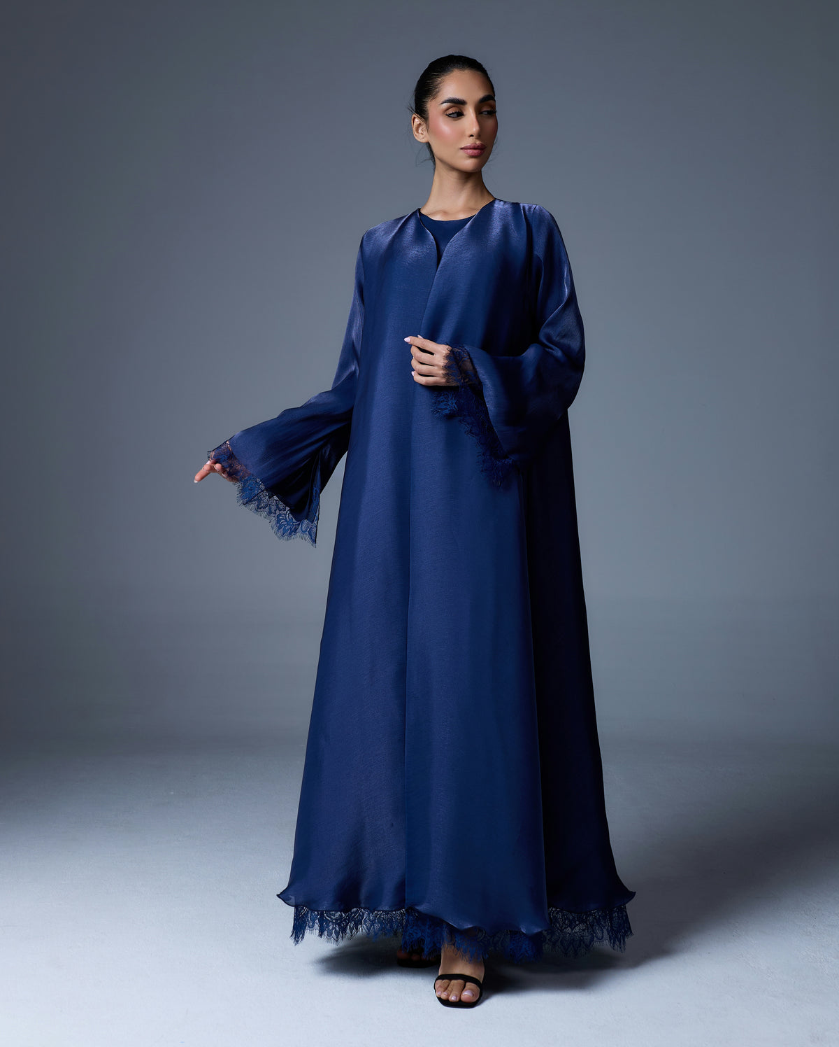 ELEGANT SILK OREGANZA ABAYA THREE PIECES SET IN LAPIS, CONSIST OF LOSE CUT ABAYA WITH HIGHER KOLAR AND FULL LACE.